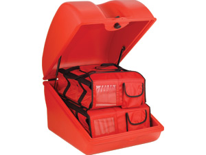 - Thermobox alt tabanının orta kısmına, çift cidar arasına, dört köşeleri somunlu polyamit çerçeve M x 8 mm civatalar ile motosikletlerin arkasına metal aksam üzerine monte edilerek, taşıma kolaylığı sağlar.